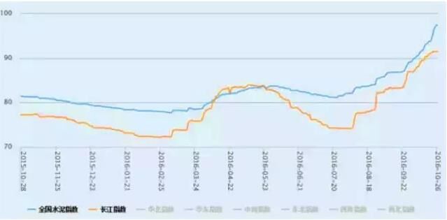 最近一年全國(guó)水泥價(jià)格指數(shù)(藍(lán)色線)和長(zhǎng)江指數(shù)(紅色線)走勢(shì)
