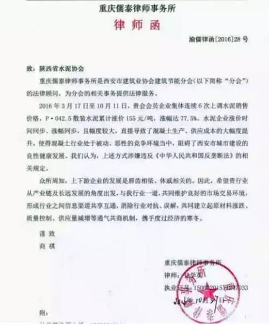 10月27日,鑒于陜西省內(nèi)水泥市場(chǎng)及混凝土市場(chǎng)發(fā)展情況,西安市建筑業(yè)協(xié)會(huì)建筑節(jié)能分會(huì)認(rèn)為這一市場(chǎng)情況違法了《中華人民共和國(guó)反壟斷法》的相關(guān)規(guī)定,并向陜西省水泥協(xié)會(huì)發(fā)律師函。希望水泥行業(yè)從產(chǎn)業(yè)鏈及長(zhǎng)遠(yuǎn)發(fā)展的角度出發(fā),與混凝土行業(yè)一道,共同維護(hù)良好的市場(chǎng)交易環(huán)境,形成行業(yè)之間信息渠道共享互通,消除行業(yè)對(duì)抗、誤解,共同建立起原材料漲跌,質(zhì)量控制、供應(yīng)量減增等通氣共商機(jī)制,攜手度過經(jīng)濟(jì)寒冬。