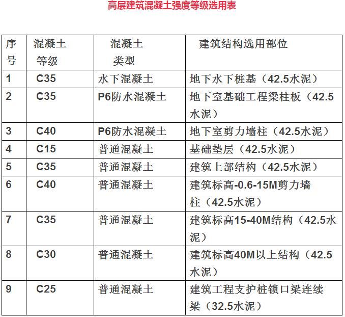 不同的建筑工程,不同的部位常采用不同強度等級的混凝土,在我國混凝土工程目前水平情況下,一般選用范圍如下: