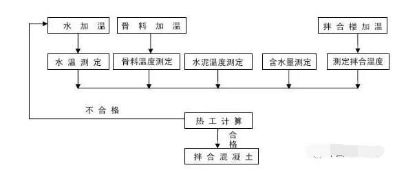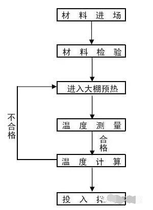 5.3根據(jù)計算結(jié)果進行判定,若計算結(jié)果表明拌和后的混凝土溫度復(fù)核驗標要求,那么可立刻進行混凝土拌和,若計算結(jié)果表明拌和后的溫度不能達到驗標要求,通過水加溫等手段提高各原材料溫度,重新進入下一道工序。