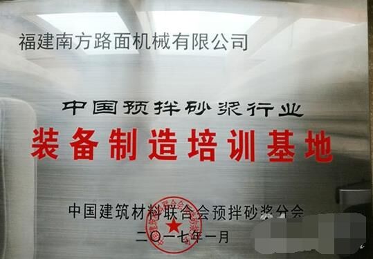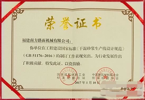 2017年1月10日,在2017'首屆中國國際預拌砂漿裝備技術(shù)研討會暨預拌砂漿綠色生產(chǎn)裝備及機械化施工技術(shù)峰會上,福建南方路面機械有限公司被中國建材聯(lián)合會預拌砂漿分會授予“中國預拌砂漿行業(yè)裝備制造培訓基地”;同時,因在國家標準GB51176-2016《干混砂漿生產(chǎn)線設(shè)計規(guī)范》編制工作中的特殊貢獻,被授予“特別貢獻單位”。