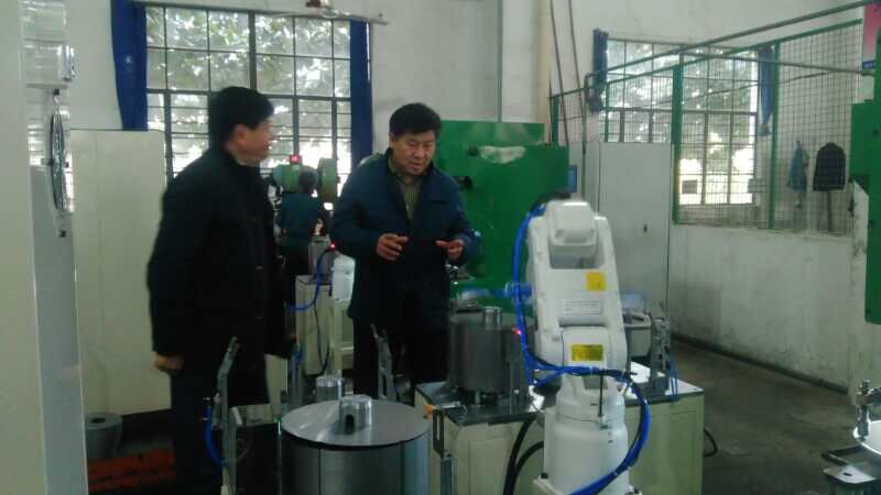 走出會(huì)議室,孫總和胡部長(zhǎng)陪同符會(huì)長(zhǎng)一行參觀(guān)公司生產(chǎn)車(chē)間,走到機(jī)加車(chē)間,符會(huì)長(zhǎng)一下子就被“機(jī)器人操作完成錐形電機(jī)定子沖槽工作”工位所吸引,孫總講,這個(gè)工位以前都是人工操作,勞動(dòng)強(qiáng)度很大,現(xiàn)在正在全力推進(jìn)工位機(jī)器人操作,不久將會(huì)全部用機(jī)器人替代。