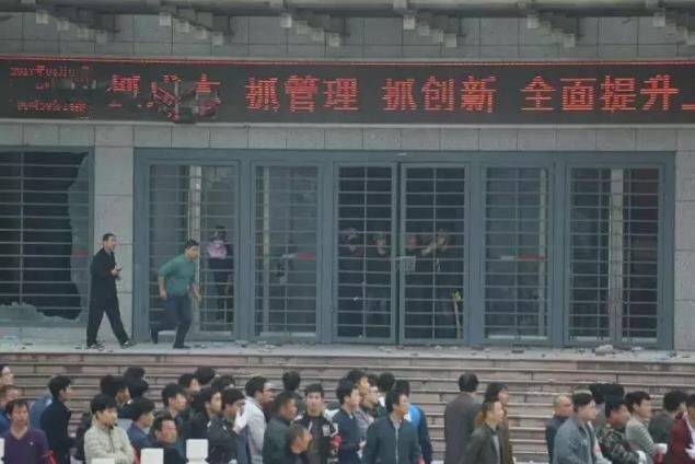 3月8日凌晨,袖纏紅護(hù)身符布條、手戴白手套,600多人拿著棍棒聚集在濟(jì)南104國道山東山水水泥集團(tuán)有限公司總部門口,強(qiáng)行沖進(jìn)大門,對辦公樓的幾個(gè)門進(jìn)行“砸打”,還從廠區(qū)強(qiáng)行把裝載機(jī)開上辦公樓門口回廊對辦公樓大門進(jìn)行蠻擊。此時(shí),集團(tuán)辦公樓里山水高管和員工只有20余人,多人在防衛(wèi)中被外邊投擲的石塊砸中受重傷,躺在醫(yī)院。