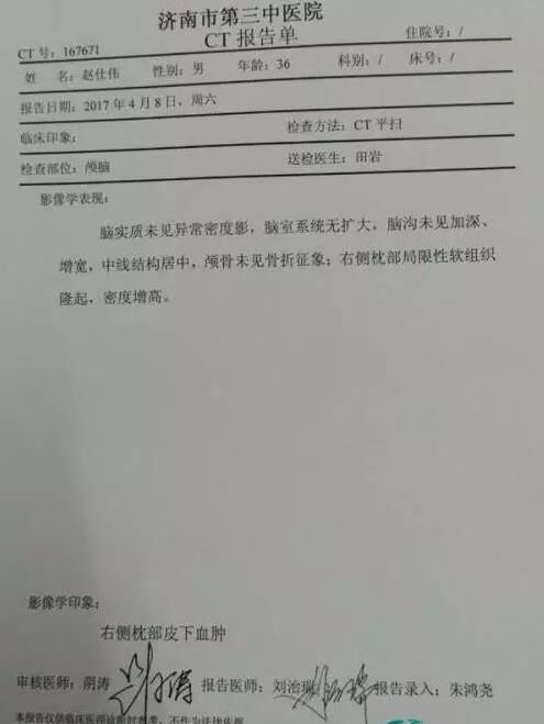 濟(jì)南市第三中醫(yī)院CT報(bào)告單顯示,趙先生右側(cè)枕部局限性軟組織隆起,密度增高。趙先生的同事周先生對記者說:“看著朋友被打成這樣,我心里很過意不去,所以我現(xiàn)在到醫(yī)院照顧他?!?/span>