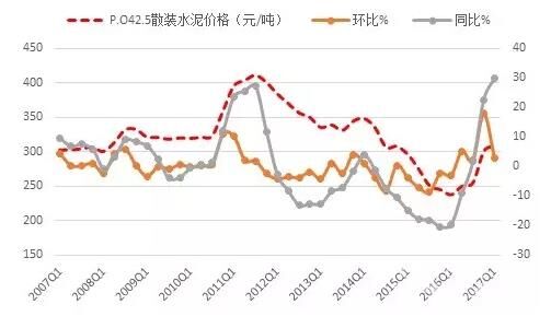 一季度,全國P.O42.5散裝水泥平均價格為309.5元/噸,環(huán)比上漲2.88%,已連續(xù)四個季度呈上漲走勢,上漲連續(xù)性近十年罕見,且同比漲幅高達30%,創(chuàng)近十年新高,高于2011年一季度23.6%的水平。