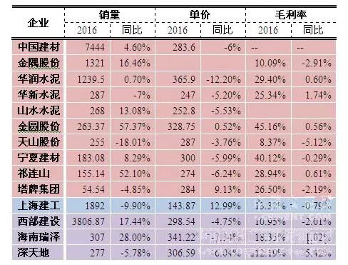 2016年,全國商品混凝土產(chǎn)量17.9億立方米,同比增長7.4%,混凝土與水泥制品行業(yè)實(shí)現(xiàn)利潤總額658億元,同比增長4.1%。從上市企業(yè)來看,14家由混凝土業(yè)務(wù)經(jīng)營的企業(yè)總銷量同比增長6.25%,但由于大部分企業(yè)混凝土銷售價格出現(xiàn)回落,導(dǎo)致13家企業(yè)(除金隅股份)整體銷售收入同比只有1.25%的提升,而11家企業(yè)(除中國建材、金隅股份、山水水泥)整體毛利潤同比下滑3.3%。