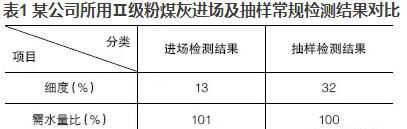 優(yōu)質(zhì)的粉煤灰摻入混凝土可明顯地改善混凝土的和易性,當(dāng)粉煤灰摻量大于膠材總量的5%~10%時,效果極為明顯?,F(xiàn)今在混凝土實際生產(chǎn)中,粉煤灰摻量往往達(dá)到20%,有的甚至高達(dá)30%,但混凝土的和易性卻不盡人意。抽取原材料進(jìn)行檢測時,發(fā)現(xiàn)粉煤灰的檢測結(jié)果經(jīng)常不滿足標(biāo)準(zhǔn)要求或者與驗收時的結(jié)果相差甚遠(yuǎn)?,F(xiàn)以某公司所用Ⅱ級粉煤灰進(jìn)場及抽樣常規(guī)檢測結(jié)果進(jìn)行對比,見表1。