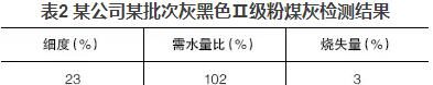 混凝土公司大多數(shù)使用的粉煤灰顏色與水泥相近,多呈灰色;也有部分粉煤灰顏色較深呈灰黑色,這種粉煤灰一般細(xì)度較細(xì)或含碳量較高。但總會發(fā)現(xiàn)一些深顏色的粉煤灰檢測結(jié)果與常理不符,如某公司某批次灰黑色Ⅱ級粉煤灰檢測結(jié)果見表2。