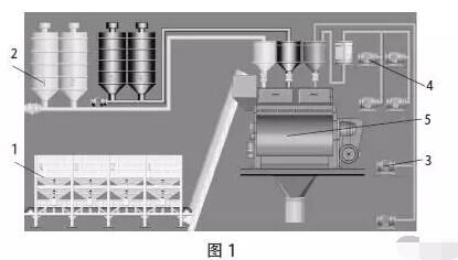 圖1為某商品混凝土攪拌站生產(chǎn)程序主界面的背景圖。1.配料機(jī),骨料秤;2.水泥煤灰等粉料倉,通過螺旋機(jī)輸送到水泥秤和煤灰秤的秤斗里,疊加秤;3.水泵;4.添加劑泵;5.攪拌機(jī)。
