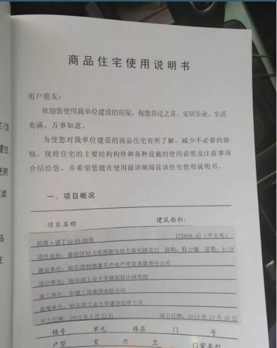 在哈爾濱市城鄉(xiāng)建設委員會官方網(wǎng)站上,記者查到了“招商諾丁山 05 地塊 8#樓”的《哈爾濱市工程竣工驗收備案證》,備案號為黑建備字號2015380,建設單位為哈爾濱招商嘉天房地產開發(fā)有限責任公司,施工單位為中建三局集團有限公司,監(jiān)理單位為哈爾濱工業(yè)大學建設項目管理公司,開竣工日期為2014年6月15日-2015年12月18日,備案日期2015年12月18日。