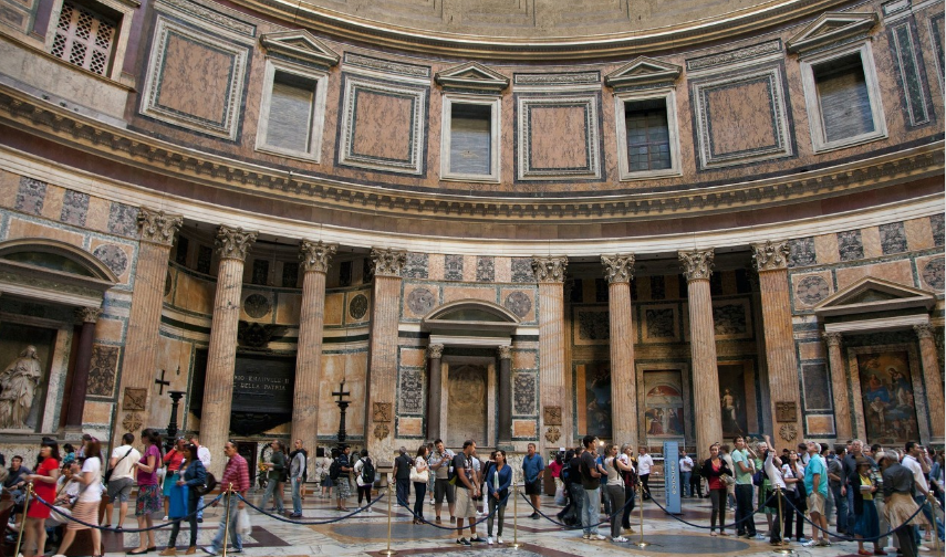 萬(wàn)神 殿是古羅馬精湛建筑技術(shù)的典范。它是一個(gè)寬度與高度相等的巨大圓柱體,上面覆蓋著半圓形的屋頂。拉斐爾等許多著名藝術(shù)家就葬在這里,葬在這里的還有意大利君主專制時(shí)期的統(tǒng)治者。對(duì)面是羅通達(dá)廣場(chǎng),廣場(chǎng)中央建有美麗的噴泉。萬(wàn)神殿是眾神所在的神殿,這里見證了歷史的變遷。