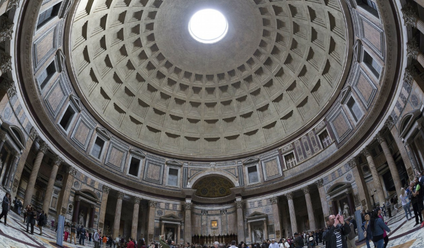 穹頂頂部的矢高和直徑一樣,也是43.3米,這樣,萬(wàn)神殿的剖面恰好可以容得下一個(gè)整圓,而它的內(nèi)部墻面兩層分割也接近于黃金分割,因此它常被作為通過(guò)幾何形式達(dá)到構(gòu)圖和諧的古代實(shí)例。