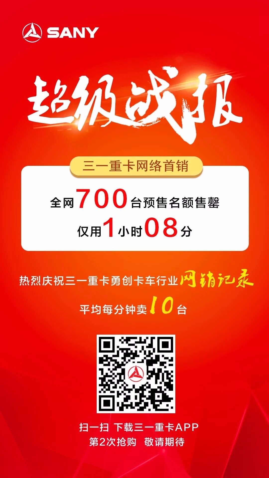 導(dǎo)語:2018年3月31日,三一重卡首批700臺預(yù)售名額在網(wǎng)絡(luò)上鳴鑼開賣,僅用1小時8分鐘,700臺預(yù)售名額搶購一空,不僅開創(chuàng)了重卡廠家網(wǎng)絡(luò)直銷的先河,更是創(chuàng)造了重卡互聯(lián)網(wǎng)銷售臺數(shù)和總金額的雙重紀(jì)錄!