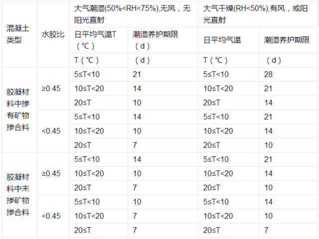 (3)養(yǎng)護持續(xù)時間以規(guī)范中所規(guī)定的時間為最短時間,豎向混凝土結構適當增加養(yǎng)護時間,結合混凝土的組成及配合比、環(huán)境溫度與濕度、養(yǎng)護方法、風力、風速等諸多因素綜合考慮。