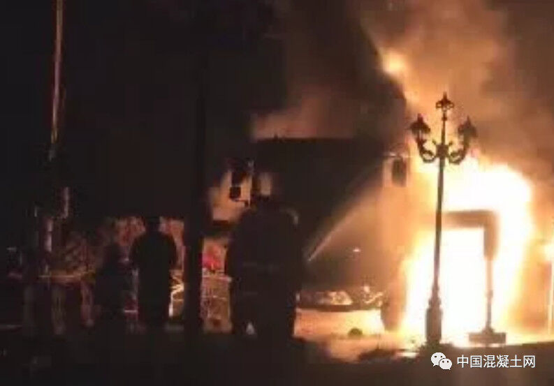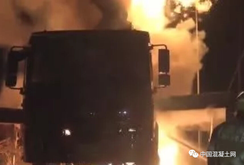 起火的混凝土泵車四個(gè)支撐柱張開(kāi),輸送混凝土的曲臂也伸展開(kāi)來(lái),整個(gè)車身被熊熊的大火包圍。泵車油箱破裂,大量的柴油外漏,現(xiàn)場(chǎng)卷起了5米多高的火舌。
