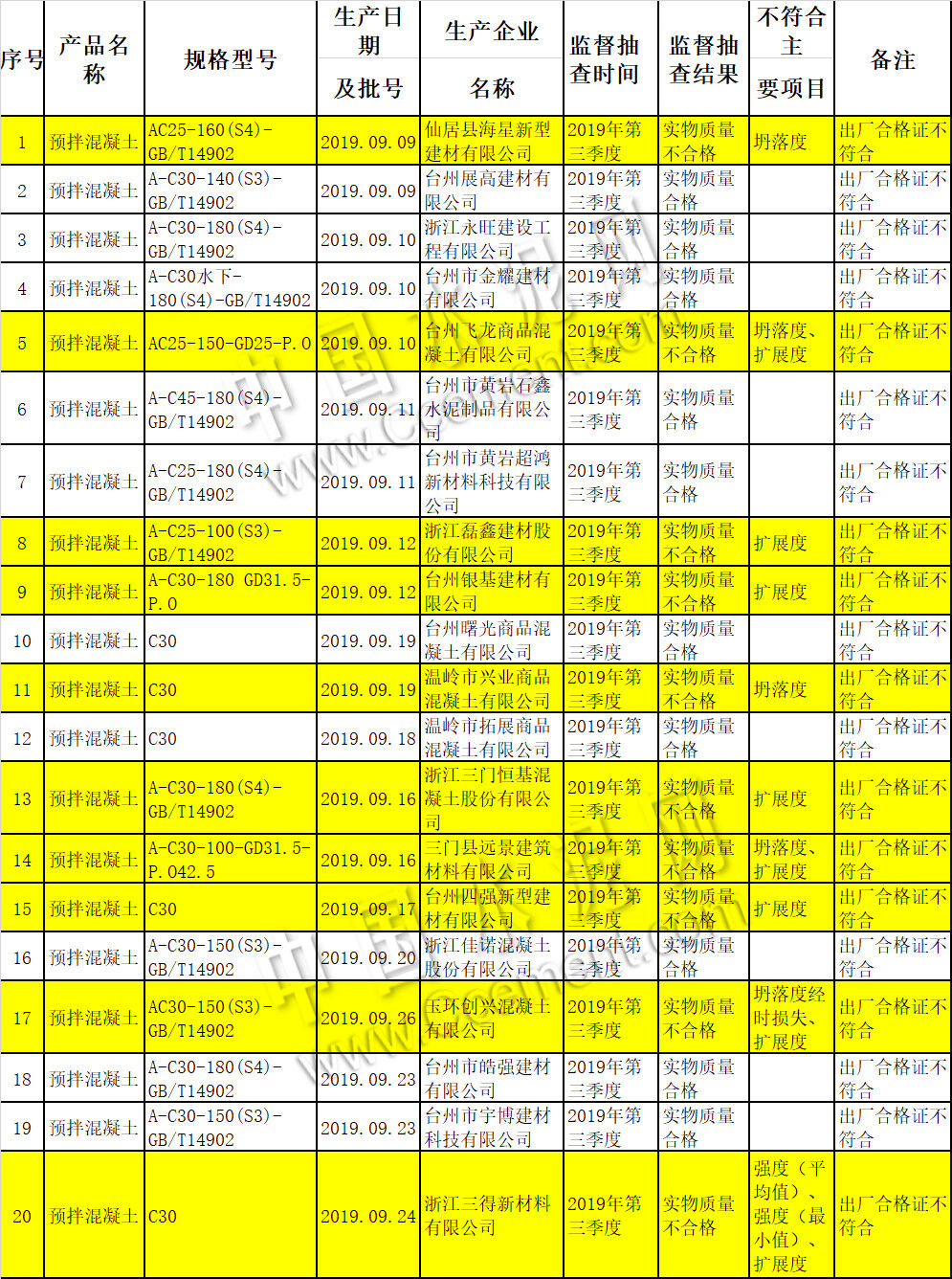 12月24日,臺(tái)州市市場(chǎng)監(jiān)督管理局官網(wǎng)發(fā)布2019年預(yù)拌混凝土產(chǎn)品質(zhì)量專項(xiàng)監(jiān)督抽查結(jié)果信息。近期,根據(jù)《中華人民共和國(guó)產(chǎn)品質(zhì)量法》、《浙江省產(chǎn)品質(zhì)量監(jiān)督條例》的規(guī)定,臺(tái)州市市場(chǎng)監(jiān)督管理局組織開展了2019年臺(tái)州市預(yù)拌混凝土產(chǎn)品質(zhì)量專項(xiàng)監(jiān)督抽查,涉及到臺(tái)州市有20家企業(yè)的20批次產(chǎn)品,其中實(shí)物質(zhì)量不合格10批次,實(shí)物質(zhì)量不合格率為50%。主要不符合項(xiàng)目為:強(qiáng)度、坍落度、坍落度經(jīng)時(shí)損失、擴(kuò)展度。本次專項(xiàng)監(jiān)督抽查發(fā)現(xiàn)合格證普遍存在不符合現(xiàn)象。