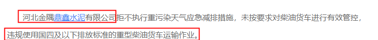 此外,今年10月河北金隅鼎鑫水泥有限公司拒不執(zhí)行重污染天氣應(yīng)急減排措施,未按要求對柴油貨車進(jìn)行有效管控,違規(guī)使用國四及以下排放標(biāo)準(zhǔn)的重型柴油貨車運(yùn)輸作業(yè),被當(dāng)?shù)丨h(huán)保部門通報(bào)。