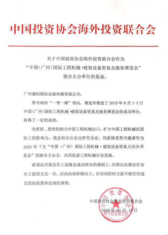 2019年開展的致力于促進“工程機械、建筑設備國際貿(mào)易與服務”的康馬展的成功舉行后,展會承辦方康馬網(wǎng)董事長劉智向中國投資協(xié)會海外投資聯(lián)合會(簡稱海合會)劉雄英會長匯報展會工作,會長對展會發(fā)展給予了充分肯定的同時欣然接受康馬申請,同意作為2020年康馬展聯(lián)合主辦方,給康馬展注入更多海外資源、開拓展會各方渠道,相信在海合會聯(lián)合主辦指導下,2020康馬展將打造成具備國際影響力的工程建筑機械國際貿(mào)易標桿展會。
