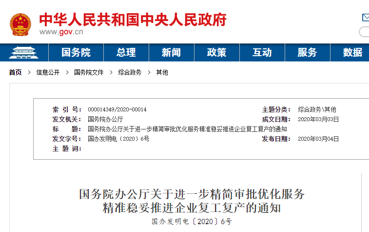 為貫徹落實(shí)黨中央關(guān)于統(tǒng)籌推進(jìn)疫情防控和經(jīng)濟(jì)社會發(fā)展工作的決策部署,深化“放管服”改革,取消不合理審批,規(guī)范審批事項(xiàng)和行為,提供便利服務(wù),精準(zhǔn)穩(wěn)妥推進(jìn)企業(yè)復(fù)工復(fù)產(chǎn),現(xiàn)就除湖北省、北京市以外地區(qū)復(fù)工復(fù)產(chǎn)有關(guān)事項(xiàng)通知如下: