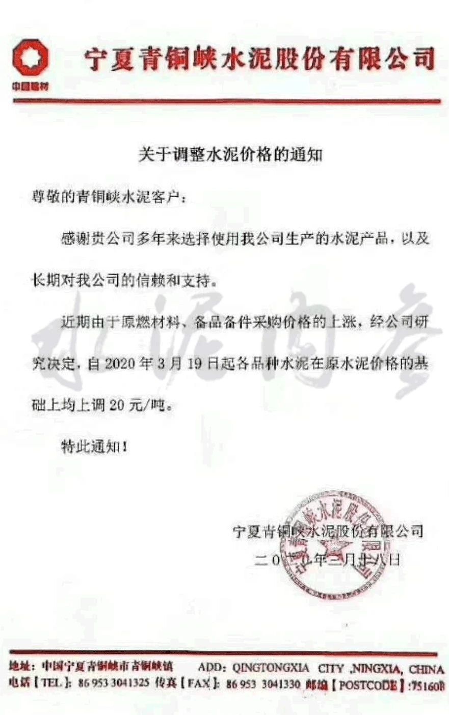 據(jù)消息:寧夏青銅峽水泥有限公司發(fā)布通知,稱由于近期原燃材料、備品備件采購(gòu)價(jià)格上漲,公司決定自3月19日起各品牌、各品種水泥在原有價(jià)格基礎(chǔ)上上調(diào)20元/噸。