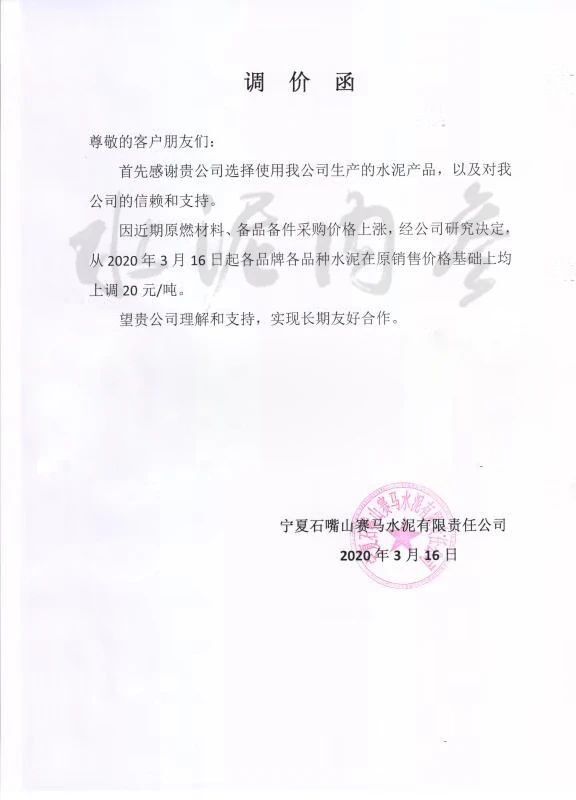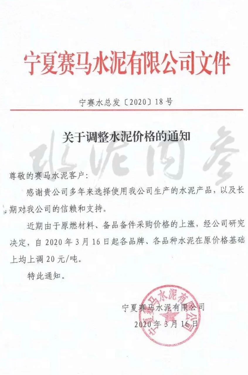 此前,寧夏賽馬水泥有限公司發(fā)布通知,稱由于近期原燃料、備品備件采購(gòu)價(jià)格上漲,公司決定自3月16日起各品牌、各品種水泥在原有價(jià)格基礎(chǔ)上上調(diào)20元/噸。