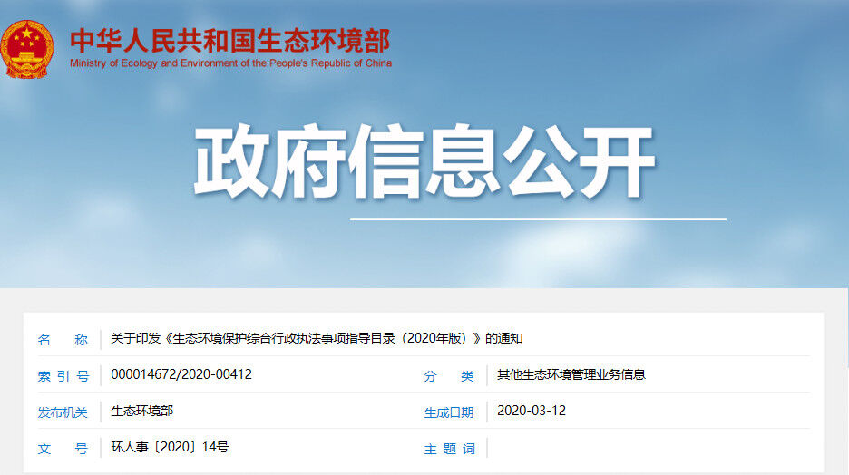 近日,生態(tài)環(huán)境部發(fā)布了關(guān)于印發(fā)《生態(tài)環(huán)境保護(hù)綜合行政執(zhí)法事項指導(dǎo)目錄(2020年版)》(以下簡稱“《指導(dǎo)目錄》”)的通知,稱根據(jù)深化黨和國家機(jī)構(gòu)改革有關(guān)安排部署,為貫徹落實《國務(wù)院辦公廳關(guān)于生態(tài)環(huán)境保護(hù)綜合行政執(zhí)法有關(guān)事項的通知》(國辦函〔2020〕18號)要求,扎實推進(jìn)生態(tài)環(huán)境保護(hù)綜合行政執(zhí)法改革,現(xiàn)印發(fā)《生態(tài)環(huán)境保護(hù)綜合行政執(zhí)法事項指導(dǎo)目錄(2020年版)》及說明。