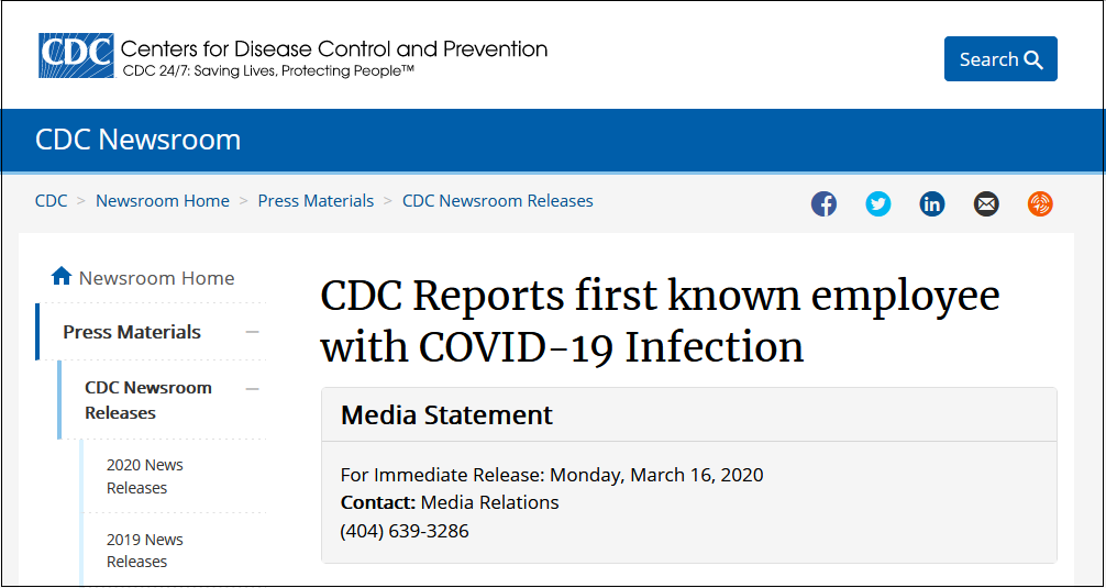 美國(guó)疾控中心出現(xiàn)首例員工感染新冠病毒病例