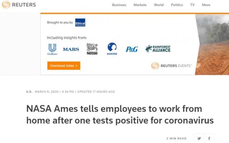 據(jù)路透社3月9日?qǐng)?bào)道,美國(guó)國(guó)家航空航天局(NASA)位于加利福尼亞州的艾姆斯研究中心3月8日發(fā)表聲明稱,該中心一員工新冠病毒檢測(cè)呈陽(yáng)性。出于謹(jǐn)慎考慮,該中心要求其他員工在家工作,直到另行通知。