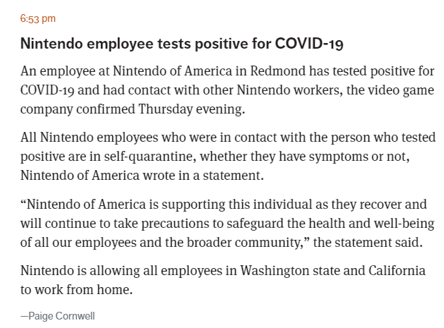 根據(jù)《西雅圖時(shí)報(bào)》的相關(guān)報(bào)道,美國(guó)任天堂一名員工目前已經(jīng)出現(xiàn)“新冠病毒檢測(cè)陽(yáng)性”的狀況,目前,與這位員工有過(guò)接觸的其他人員已經(jīng)開(kāi)始自我隔離?!段餮艌D時(shí)報(bào)》報(bào)道原文:
