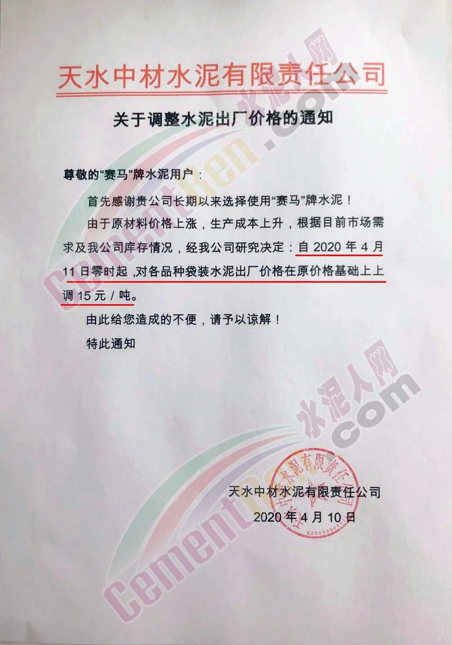 昨日(4月10日)天水中材水泥有限責(zé)任公司通知,由于原材料價(jià)格上漲,生產(chǎn)成本上升,根據(jù)目前市場(chǎng)需求公及公司庫(kù)存情況 ,經(jīng)公司研究決定自今日(4月11日)零時(shí)起,對(duì)各品種袋裝水泥出廠價(jià)格在原價(jià)格基礎(chǔ)上上調(diào)15元/噸。