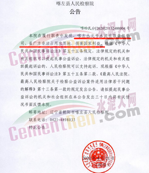 據(jù)了解,4月21日,遼寧省朝陽(yáng)市喀左縣人民檢察院在履行職責(zé)中發(fā)現(xiàn),喀左叢元號(hào)水泥有限責(zé)任公司、崔廣方非法占用農(nóng)用地,損害國(guó)家利益。根據(jù)《中華人民共和國(guó)民事訴訟法》第五十五條規(guī)定,法律規(guī)定的機(jī)關(guān)和有關(guān)組織可以提起民事公益訴訟,法律規(guī)定的機(jī)關(guān)和有關(guān)組織提起訴訟的,人民檢察院可以支持起訴。