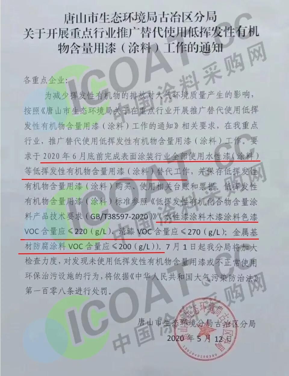 摘要:近幾年,涂料行業(yè)的“油改水”做的轟轟烈烈,全國各地也陸續(xù)出臺很多支持政策,但是總是雷聲大雨點小,很多政策模棱兩可,讓從業(yè)者無所適從,而近日河北唐山市生態(tài)環(huán)境局古冶區(qū)分局發(fā)布了一則重要通知,明確了使用水性漆的截止日期,并同步了處罰依據(jù),為水性涂料行業(yè)打入一劑強心劑。通知如下:
