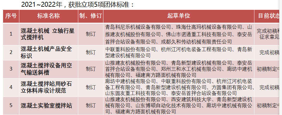 以市場(chǎng)需求為導(dǎo)向,圍繞產(chǎn)品鏈,今年重點(diǎn)從“關(guān)鍵部件/系統(tǒng),新材料、新能源,智能產(chǎn)品、智能互聯(lián)”方1立項(xiàng)團(tuán)體標(biāo)準(zhǔn),引導(dǎo)和服務(wù)混凝十機(jī)械行、發(fā)展。 2022年擬申請(qǐng)團(tuán)體標(biāo)準(zhǔn)立項(xiàng)10項(xiàng)以上。