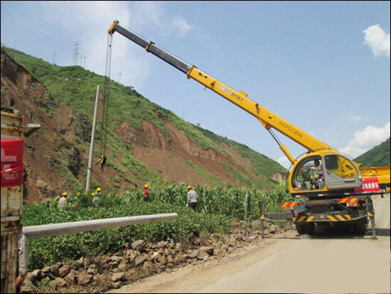 筆者連線徐工起重機(jī)事業(yè)部駐云南辦事處卞泳主任,他介紹了相關(guān)情況。8月7日上午,魯?shù)榭h城通往震中龍頭山鎮(zhèn)的道路經(jīng)過(guò)兩日的搶修和交通管制已基本暢通,武警交通部隊(duì)決定允許放行小型汽車起重機(jī)。指揮部要求南方電網(wǎng)公司迅速完成龍頭山鎮(zhèn)幾處電線桿及變壓設(shè)備的安裝。南方電網(wǎng)公司考慮道路情況惡劣,決定征用一直等候在交通管制境界線之外的一臺(tái)徐工QY12B.5汽車起重機(jī),徐工12噸起重機(jī)迅速到達(dá)現(xiàn)場(chǎng)投入搶修。
