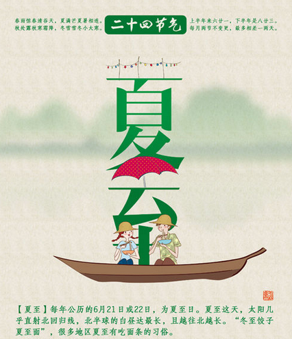 夏至是二十四節(jié)氣中最早被確定的一個(gè)節(jié)氣。公元前七世紀(jì),先人采用土圭測(cè)日影,就確定了夏至。每年的夏至從6月21日(或22日)開(kāi)始,至7月7日(或8日)結(jié)束。據(jù)《恪遵憲度抄本》:“日北至,日長(zhǎng)之至,日影短至,故曰夏至。至者,極也。”夏至這天,太陽(yáng)直射地面的位置到達(dá)一年的最北端,幾乎直射北回歸線(北緯23°26\'),北半球的白晝達(dá)最長(zhǎng),且越往北晝?cè)介L(zhǎng)。如海南的??谑羞@天的日長(zhǎng)約13小時(shí)多一點(diǎn),杭州市為14小時(shí),北京約15小時(shí),而黑龍江的漠河則可達(dá)17小時(shí)以上。夏至以后,太陽(yáng)直射地面的位置逐漸南移,北半球的白晝?nèi)諠u縮短。民間有“吃過(guò)夏至面,一天短一線”的說(shuō)法。而此時(shí)南半球正值隆冬。