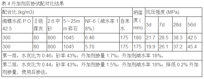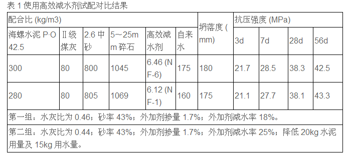 試配對(duì)比結(jié)果分析:其他材料相同,使用高效減水劑(NF-1),保持砂率及外加劑摻量不變,適當(dāng)降低水泥用量及用水量,使水灰比降低,在相同的坍落度下28d 及 56d 強(qiáng)度相近并降低了成本。