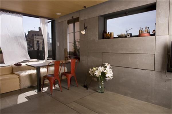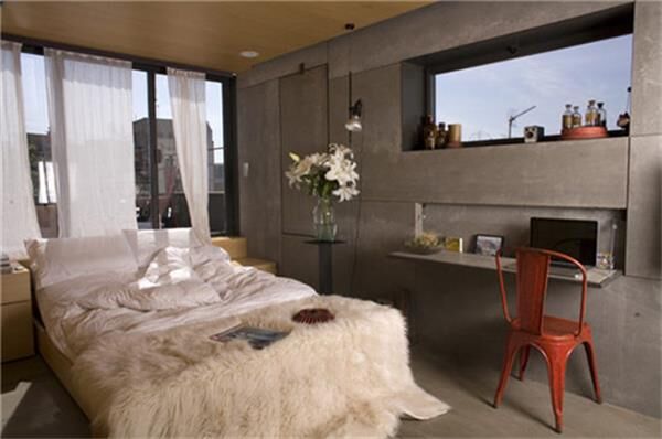床的亮點設(shè)計在于它是可以伸縮的。白天可以推進去,這里充當飄窗的作用。墻面也是頗有創(chuàng)意和實用性,隱藏在墻上的混凝土板,拉下來變成方便的書桌或是餐桌。