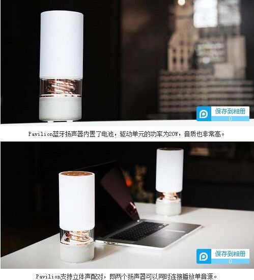 牙3.0和aptX編碼,能夠帶來CD般的音質表現(xiàn)。除了單獨使用之外,你也可以用兩個Pavilion組成立體聲來播放同一個音源。