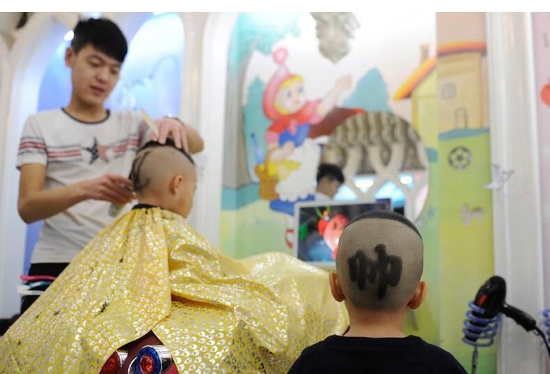 一個(gè)孩子正在“剃喜頭”。