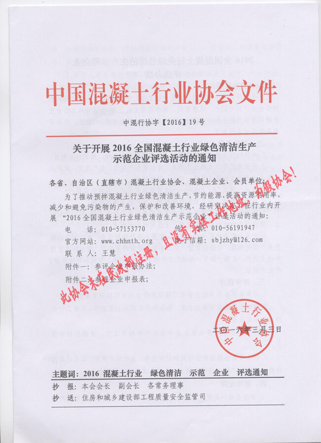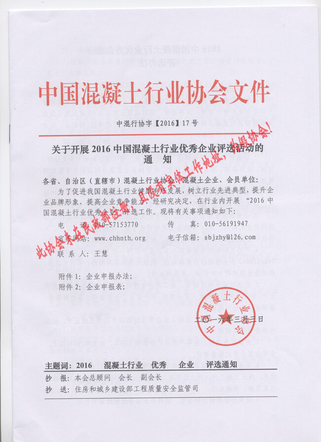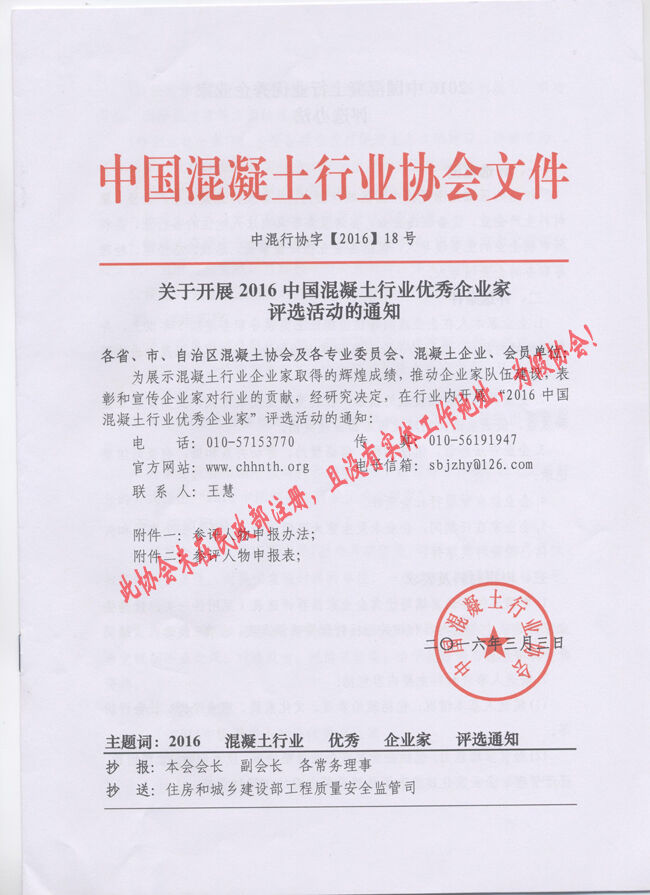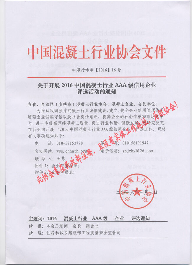 近日,有多家省市協(xié)會(huì)和有關(guān)生產(chǎn)企業(yè)向分會(huì)秘書處反映收到“中國(guó)混凝土行業(yè)協(xié)會(huì)”2016(16、17、18、19、20)文件開(kāi)展所謂的“中國(guó)混凝土行業(yè)評(píng)選活動(dòng)”的通知。