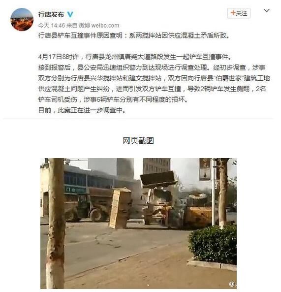 17日8時許,行唐縣發(fā)生鏟車互撞事件。經(jīng)警方初步調(diào)查,涉事雙方為行唐縣兩攪拌站,因向某建筑工地供應(yīng)混凝土問題產(chǎn)生糾紛,進(jìn)而沖突。致2輛鏟車發(fā)生側(cè)翻,2名鏟車司機受傷,涉事6輛鏟車分別有不同程度的損壞。該案還在進(jìn)一步調(diào)查中。