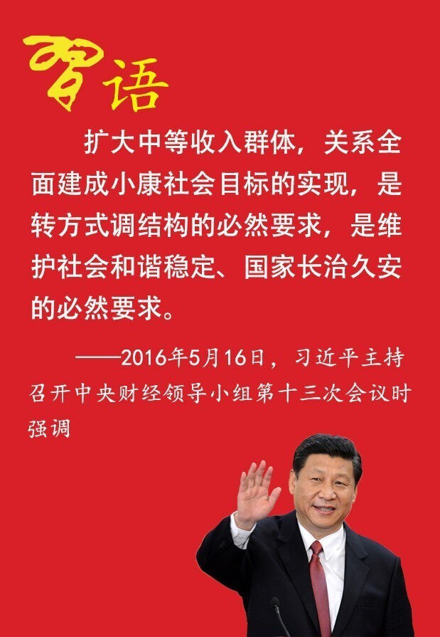 2016年5月16日,習(xí)近平主持召開中央財(cái)經(jīng)領(lǐng)導(dǎo)小組第十三次會(huì)議,分別研究落實(shí)供給側(cè)結(jié)構(gòu)性改革、擴(kuò)大中等收入群體工作。他強(qiáng)調(diào)要堅(jiān)持以人民為中心的發(fā)展思想,在全社會(huì)大力弘揚(yáng)勤勞致富、艱苦奮斗精神,激勵(lì)人們通過勞動(dòng)創(chuàng)造美好生活,不斷提高生活水平。
