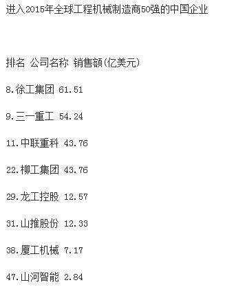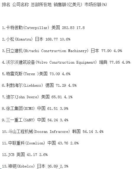 分析指出,受大宗商品價格下跌、新型經(jīng)濟(jì)體經(jīng)濟(jì)增速減緩和世界經(jīng)濟(jì)不景氣的影響,全球前50家工程機(jī)械制造企業(yè)總產(chǎn)值較上一年度下跌16.2%,達(dá)到1330億美元,創(chuàng)2009年以來新低。據(jù)中國工程機(jī)械商貿(mào)網(wǎng)編輯了解,2009年,工程機(jī)械行業(yè)一年銷售額下降了1090億美元。自那時起,工程機(jī)械行業(yè)收入下降趨勢一直未有改變。報告同時強(qiáng)調(diào),榜單上下滑最為嚴(yán)重的是中國企業(yè),這很大程度上是因?yàn)橹袊?jīng)濟(jì)增速的放緩。中國企業(yè)中,只有徐工集團(tuán)仍然保持在前十強(qiáng),位列榜單第九位?!斑@個市場趨勢表現(xiàn)最顯著的就是中國建筑設(shè)備制造商,相比去年,所有中國企業(yè)的排名有所下滑。排名前十的企業(yè)中,如今只有徐工一家中國工程機(jī)械制造廠商?!?/span>