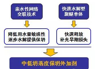 綜合來講,PCE減水劑在配制中低坍落度混凝土方面提供了有效技術(shù)保障。中低坍落度減水劑作用技術(shù)線路圖如下圖所示: