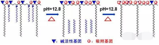 其次,快速水解型聚醚單體應(yīng)用,由于水泥水化前期速度較快,自由水消耗較多,在低自由水量前提下,通過調(diào)控水解釋放速率與側(cè)鏈脫落、水化掩埋之間的平衡,既有效降低前期流動度損失,又避免后期反向增長??焖偎馓峁┓稚恿ψ饔檬疽鈭D如下: