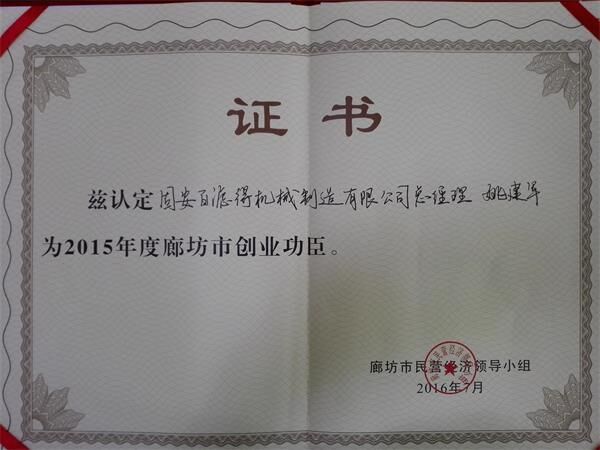 近日,固安百濾得機械制造有限公司總經(jīng)理姚建軍榮獲廊坊市創(chuàng)業(yè)功臣獎,獎金十萬元整,也正是如此,更加說明市場對百濾得的認可,百濾得對市場的優(yōu)質(zhì)服務。