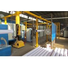 布料機(jī)專利設(shè)計(jì)的膠帶機(jī)頭部清掃器是為輸送混凝土清掃砂漿的特殊要求設(shè)計(jì)的。刮刀采用硬質(zhì)合金材料,矩型段面,耐磨且不傷膠帶,砂漿損失小。上料膠帶機(jī)設(shè)計(jì)為由兩節(jié)輕型桁架的鉸接結(jié)構(gòu),上端鉸接在車架上的轉(zhuǎn)料斗上,通過鉸接油缸根據(jù)需要調(diào)整兩節(jié)桁架之間的角度;在膠帶機(jī)的下部,設(shè)計(jì)有萬向輪,在油缸的驅(qū)動(dòng)下可沿桁架軸向移動(dòng),可調(diào)整膠帶尾部的高度。