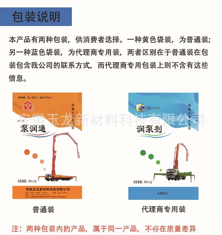 泵車潤管劑(泵潤通)產(chǎn)品使用了可降解彩色復(fù)膜包裝,包裝規(guī)格:50袋/箱,300克/袋。本產(chǎn)品應(yīng)儲(chǔ)存于防曬、通風(fēng)、干燥處,保質(zhì)期:三年。