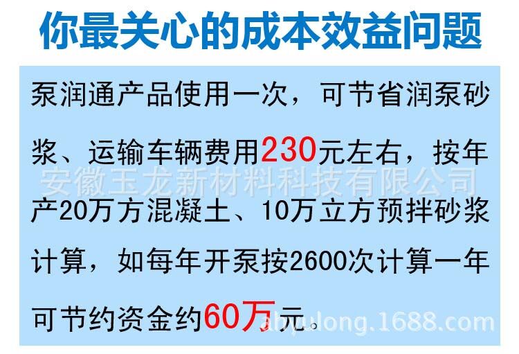 泵潤通產(chǎn)品使用一次,可節(jié)省潤泵砂漿、運(yùn)輸車輛費(fèi)用230元左右,按年產(chǎn)20萬方混凝土、10萬立方預(yù)拌砂漿計(jì)算,如每年開泵按2600次計(jì)算一年可節(jié)約資金約60萬元。