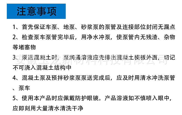 3、泵送混凝土?xí)r,泵潤通溶液應(yīng)先排出混凝土模板外面,切記不可澆入混凝土結(jié)構(gòu)中;